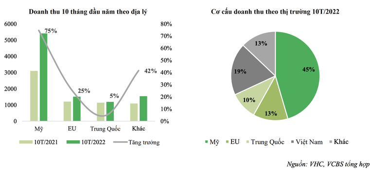 Đối với Vĩnh Hoàn, VCBS cho biết, VHC vẫn duy trì ổn định thị phần của mình ở các thị trường. Doanh thu tăng trưởng mạnh mẽ ở hai thị trường Mỹ và châu Âu (lần lượt là 75% và 25%). Doanh thu xuất khẩu tại thị trường Trung Quốc tăng nhẹ 5%.
