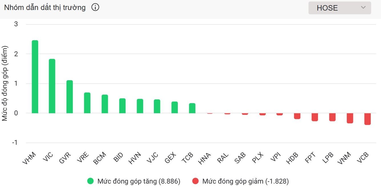 Với đà tăng của mình, VHM, VRE, VIC, GVR và BCM trực tiếp góp thêm cho VN-Index 6,723 điểm. Trong đó, VHM tích cực hơn cả khi đóng góp 2,464 điểm cho chỉ số.