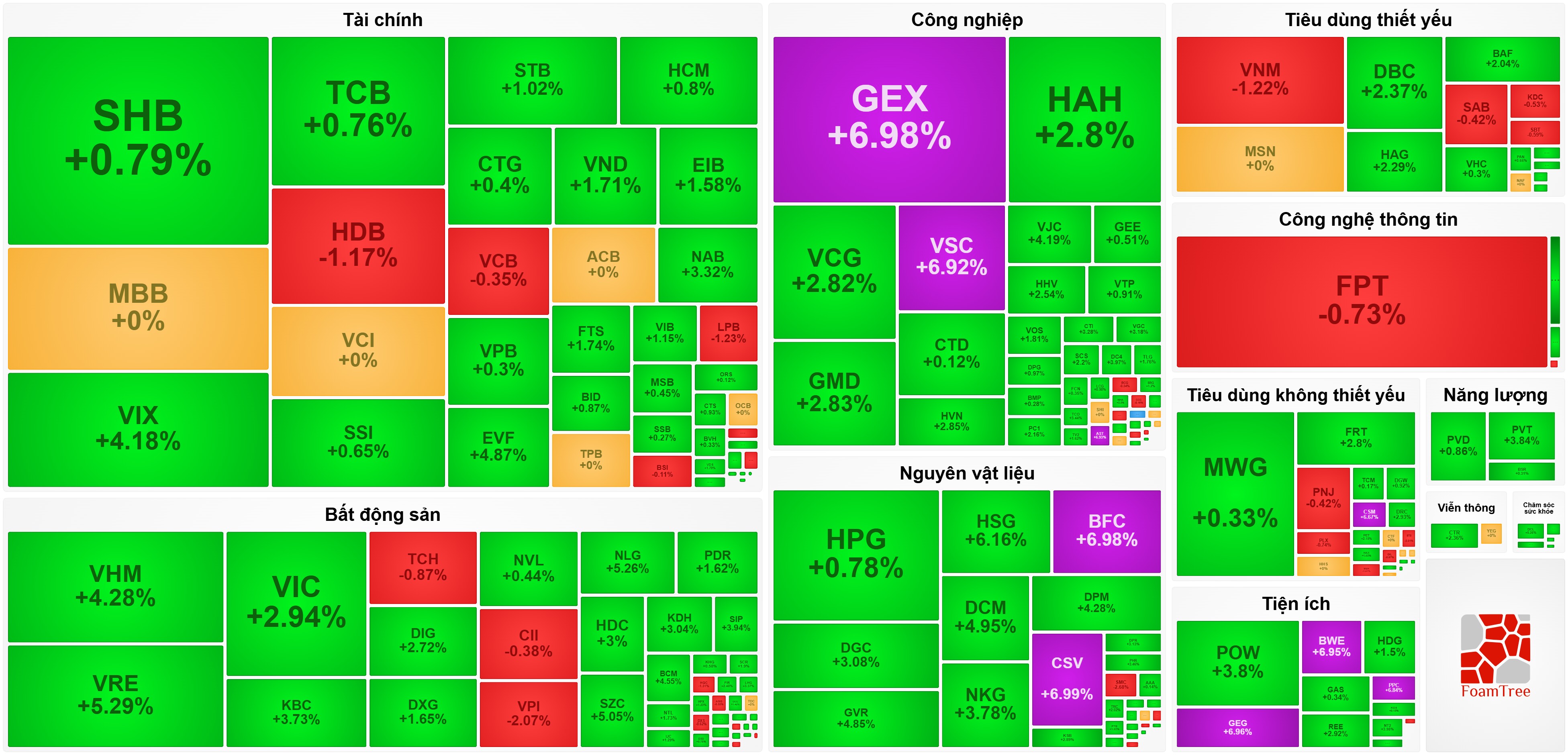 Cổ phiếu bất động sản đóng vai trò trụ đỡ chính, với bộ ba cổ phiếu họ Vingroup bật tăng tốt giúp giữ nhịp chỉ số, trong đó VHM tăng 4,1%, VIC tăng 3,4%, VRE tăng 3,3%. Một số mã khác trong nhóm bất động sản có mức tăng khả quan như NLG (3,5%), KBC (1,3%)...