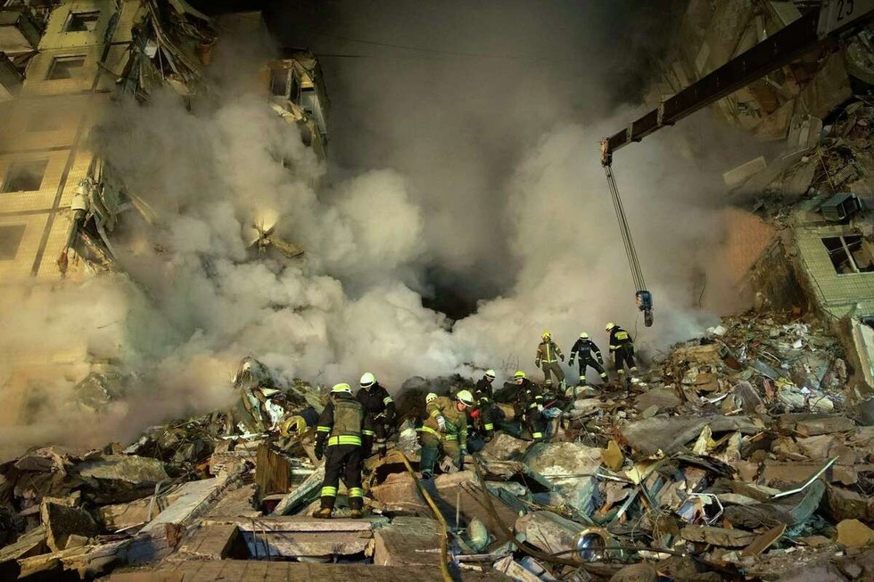 | Hiện trường một tòa nhà cao tầng đổ sập ở Dnipro do trúng tên lửa Nga, tháng 1/2023. Ảnh: AP |