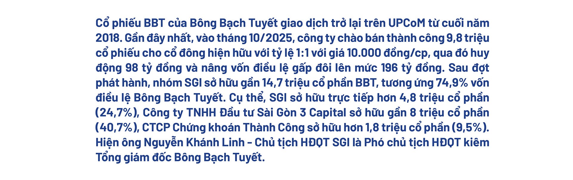 Việc “hồi sinh” thương hiệu Bông Bạch Tuyết vẫn đang tiếp tục được đội ngũ đẩy mạnh. Năm 2025, SGI đã “kết nạp” thêm CTCP Xuất nhập khẩu Y tế Thành phố Hồ Chí Minh (Yteco, mã YTC) vào hệ sinh thái. Đây là doanh nghiệp hoạt động trong mảng xuất nhập khẩu dược phẩm, nguyên liệu dược, trang thiết bị y tế… kỳ vọng sẽ hỗ trợ thêm đầu ra cho các sản phẩm của Bông Bạch Tuyết.