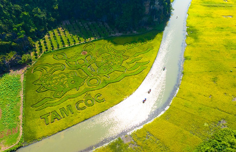 | Bức tranh "Lý ngư vọng nguyệt" được tạo hình trên cánh đồng lúa chín tại Tam Cốc. Ảnh: Ninh Binh gov. |