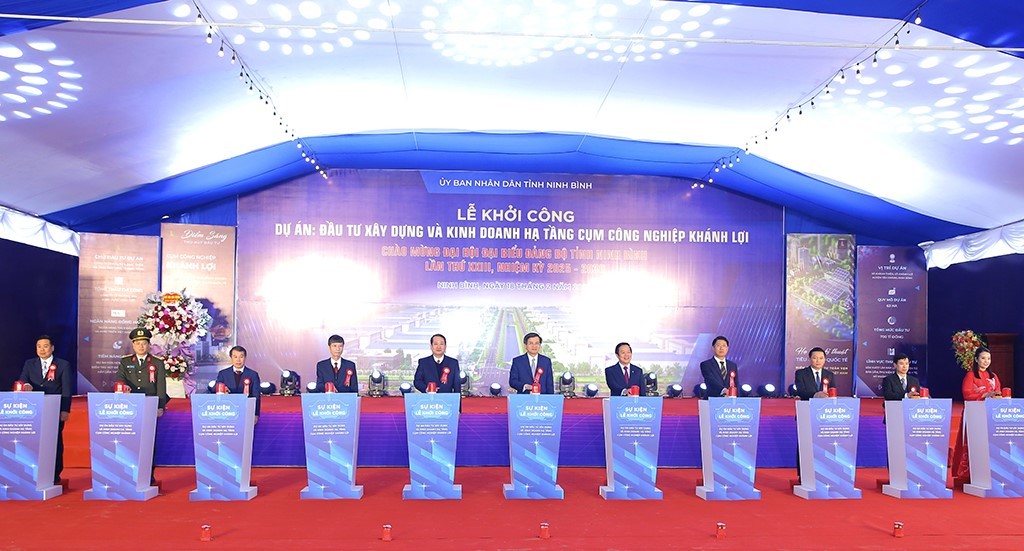 | Các đại biểu thực hiện nghi thức thực hiện nghi thức khởi công Dự án đầu tư xây dựng và kinh doanh hạ tầng cụm công nghiệp Khánh Lợi. Ảnh: Báo Ninh Bình. |