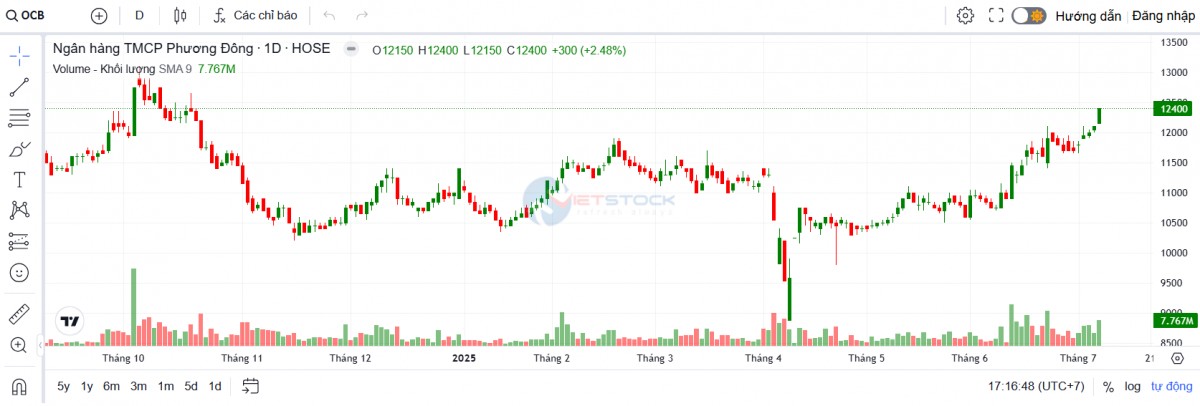 Trên thị trường chứng khoán, chốt phiên giao dịch ngày 7/7, cổ phiếu OCB ghi nhận chuỗi tăng giá ấn tượng trong 5 phiên liên tiếp, chốt phiên 7/7 ở mức 12.400 đồng/cổ phiếu, tăng tổng cộng 5,1% so với đầu tháng. Thanh khoản duy trì ở mức cao với khối lượng giao dịch gần 7,8 triệu cổ phiếu trong phiên gần nhất.