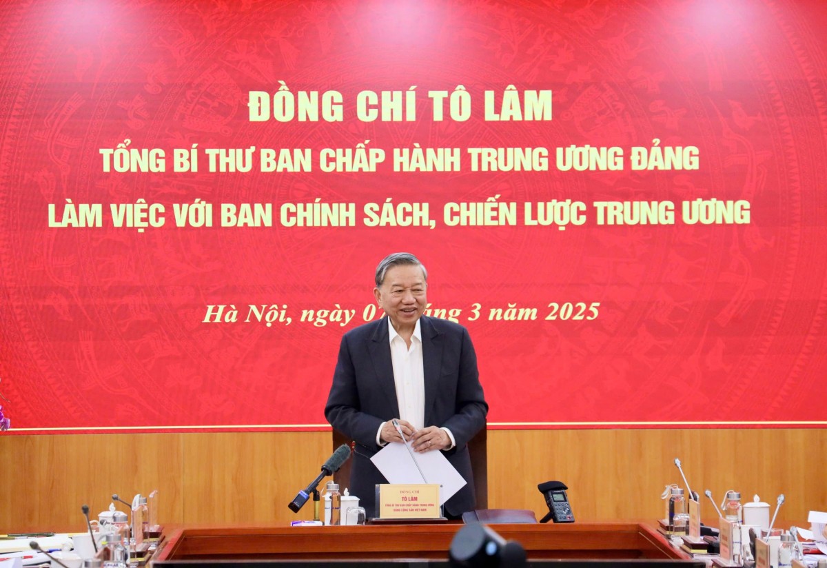 | Tổng Bí thư Tô Lâm phát biểu kết luận tại buổi làm việc. Ảnh: Ban Chính sách, chiến lược Trung ương. |