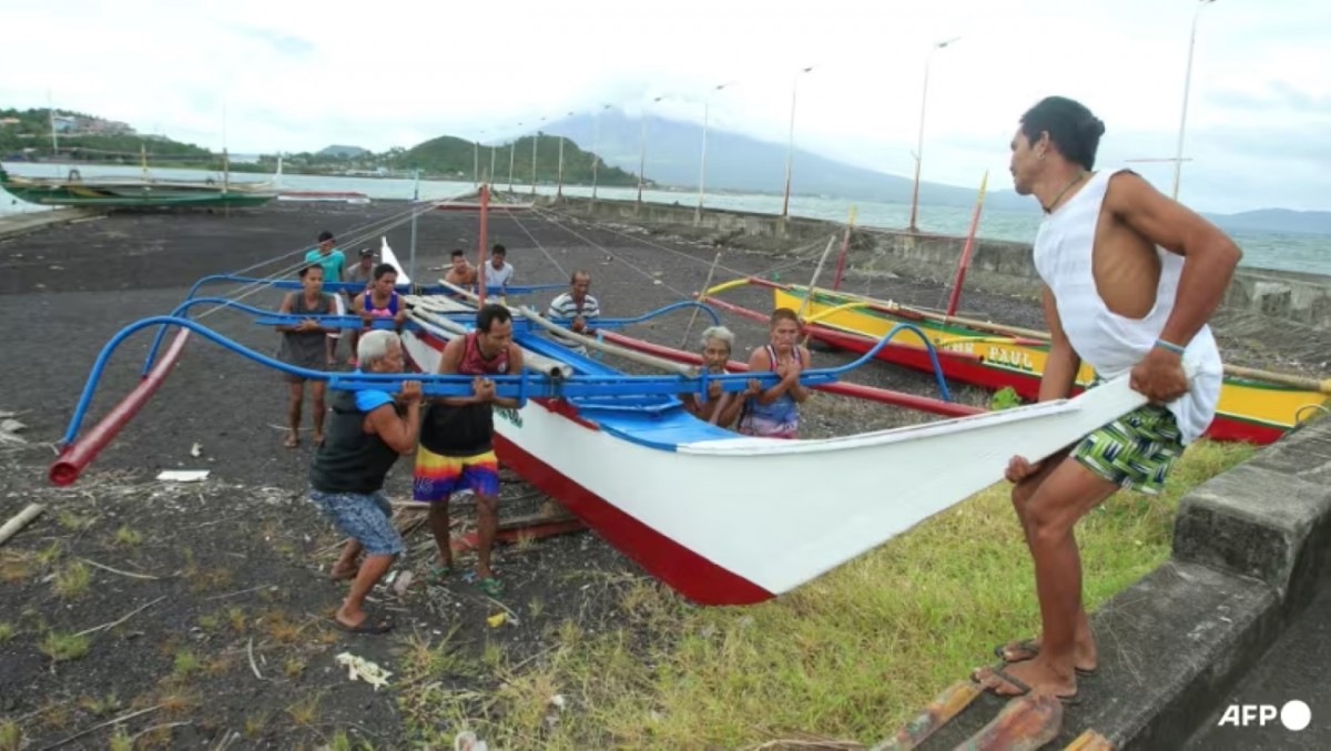 | Ngư dân mang một chiếc thuyền đánh cá bằng gỗ đến nơi an toàn tại một ngôi làng ở thành phố Legaspi, tỉnh Albay, ngày 16/11. Ảnh: AFP |