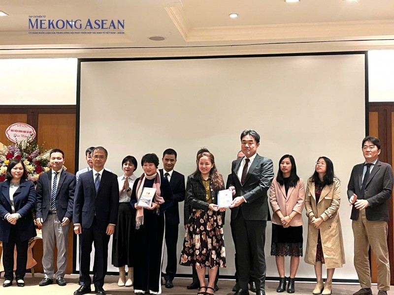 | Ông Sugano Yuichi, Trưởng Đại diện văn phòng JICA Việt Nam trao tặng sách cho đại diện nhóm tác giả. Ảnh: Thu Thảo/Mekong ASEAN. |
