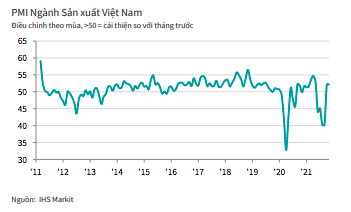 Chỉ số PMI sản xuất do IHS Markit đo lường cũng cho thấy sự khởi sắc của lĩnh vực công nghiệp tại Việt Nam