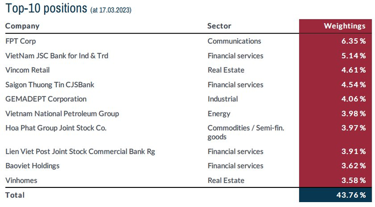 Theo đó, Top 10 cổ phiếu chiếm tỷ trọng lớn nhất trong danh mục đầu tư quỹ lần lượt gồm: FPT, CTG, VRE, STB, GMD, PLX, HPG, LPB, BVH, VHM.