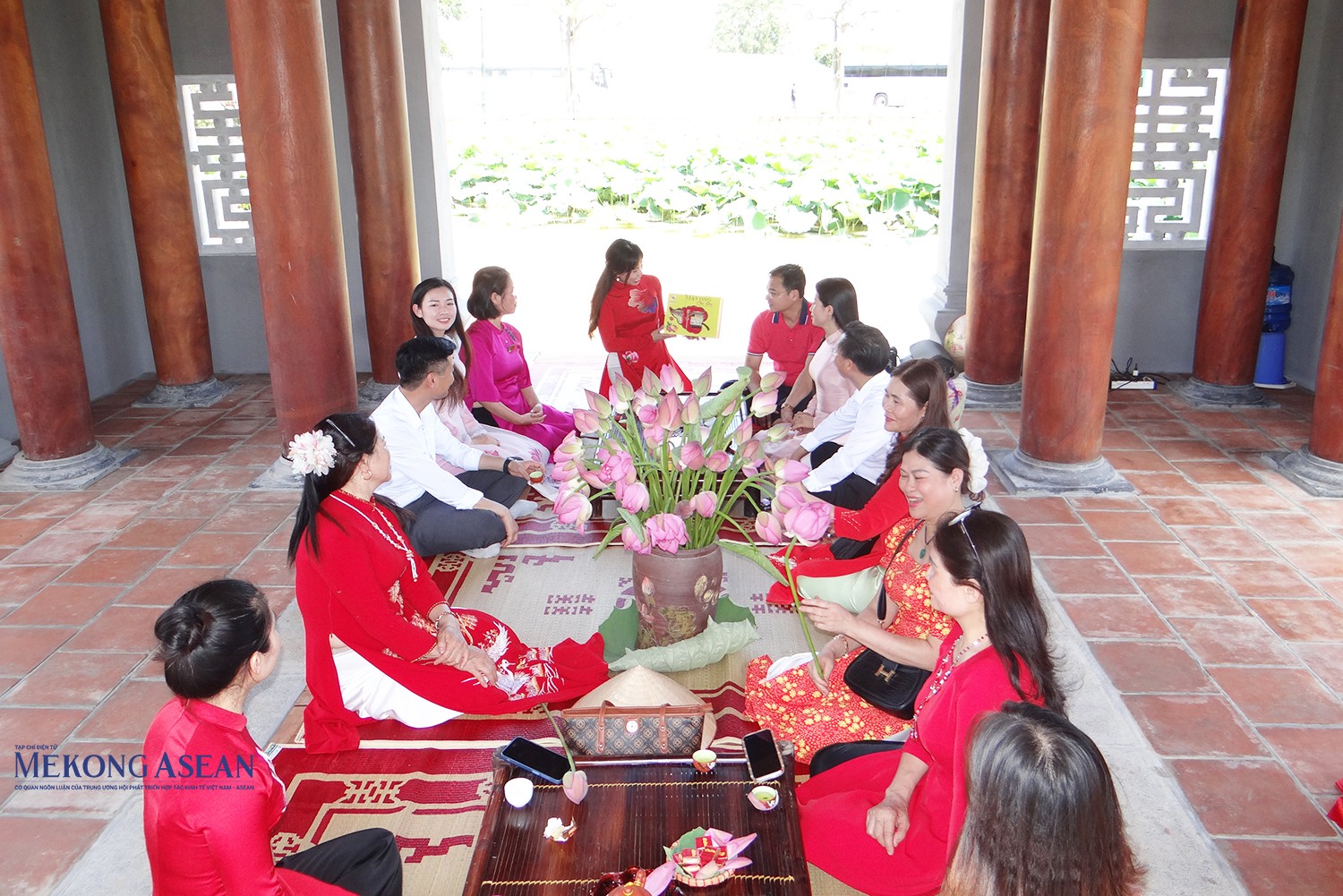 | Các đại biểu thưởng thức trà và bánh đậu xanh tại thủy đình ở hồ sen Kiếp Bạc. |