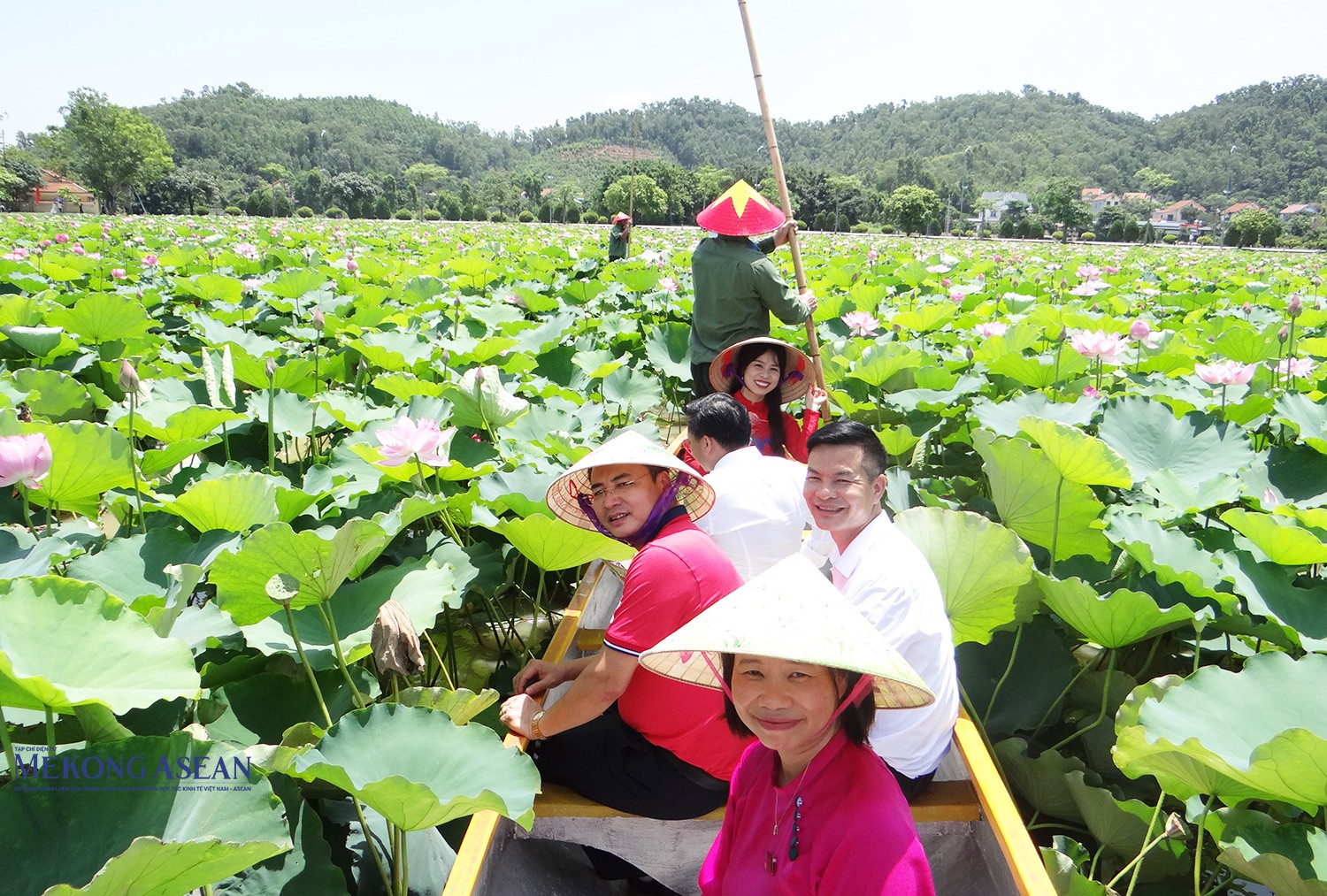 | Lãnh đạo Ban Quản lý di tích Côn Sơn - Kiếp Bạc đưa du khách đi trải nghiệm quy trình ướp trà sen trên hồ. |