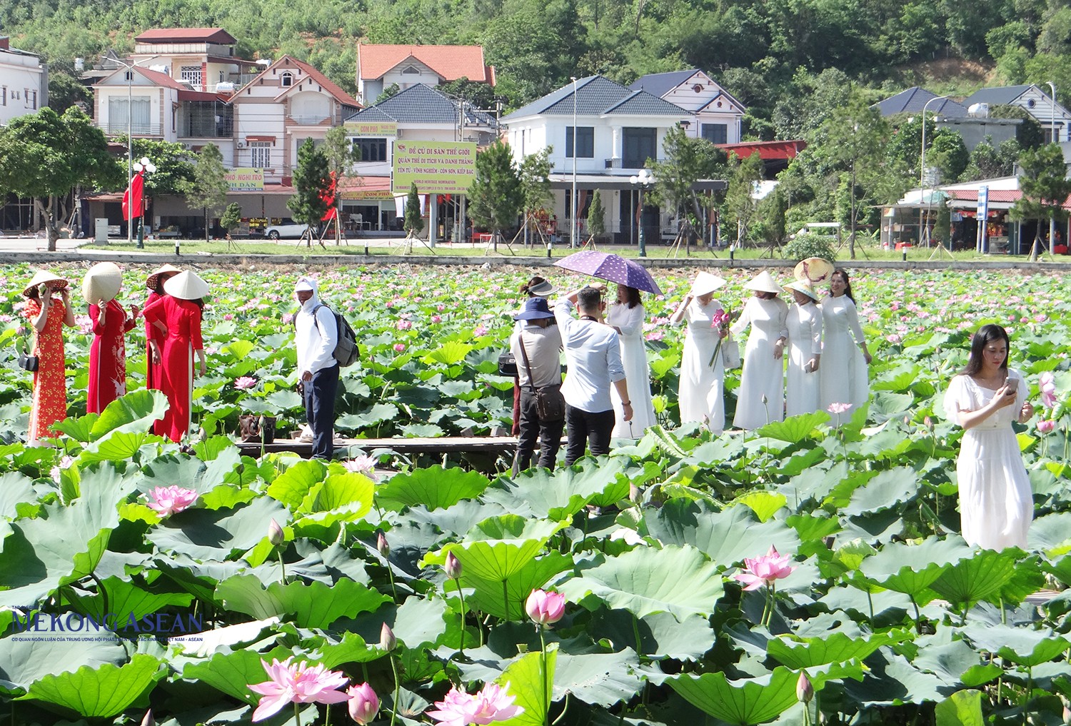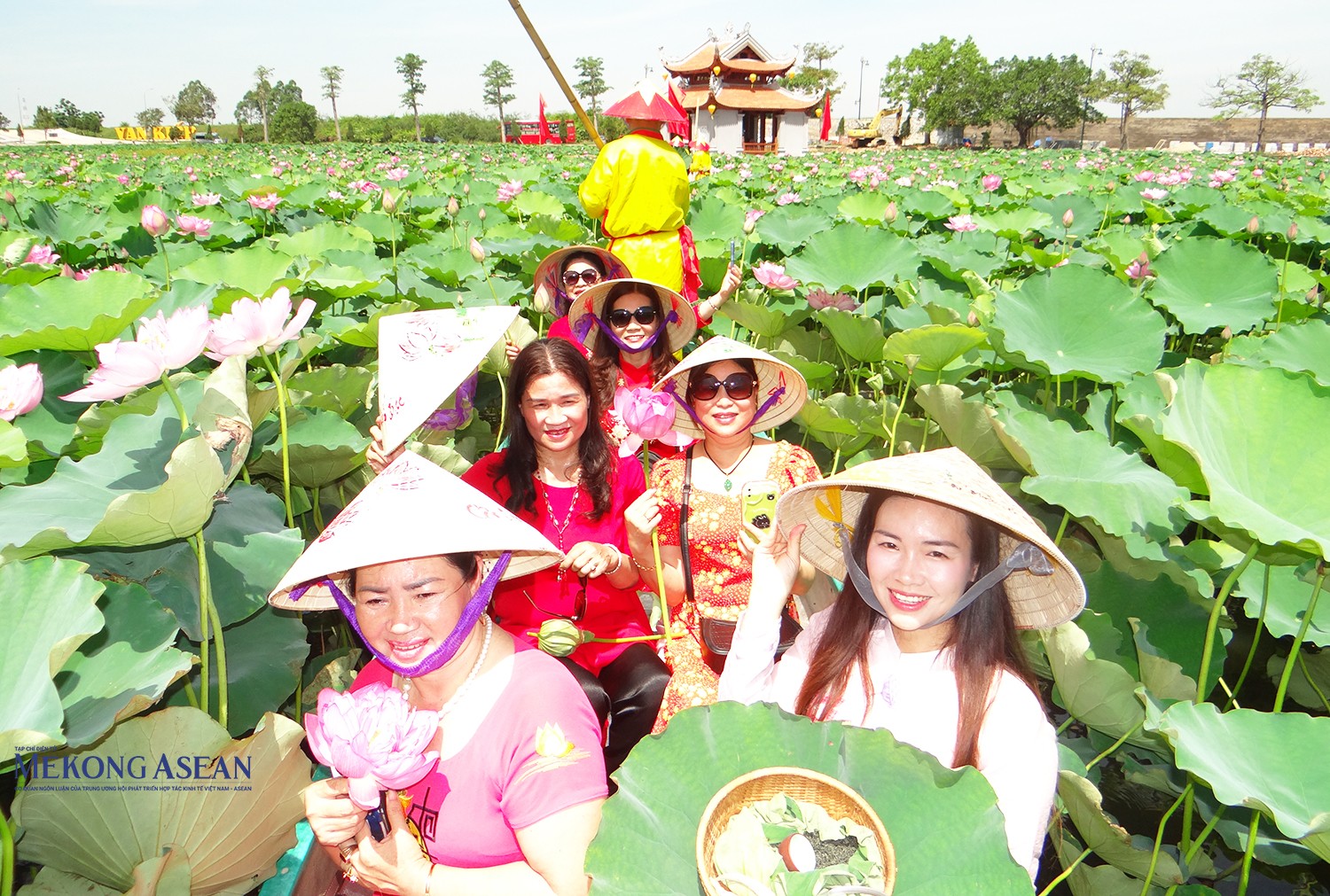 | Nhân dịp này, Ban tổ chức đồng thời công bố tour trải nghiệm sen Kiếp Bạc. Trong ảnh: Du khách chụp ảnh check-in tại hồ sen. |