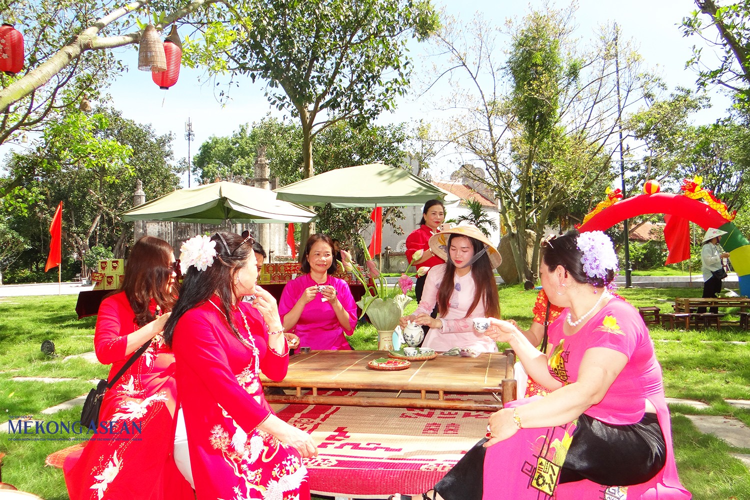 | Du khách thưởng thức trà sen Kiếp Bạc kết hợp với bánh đậu xanh Côn Sơn. |