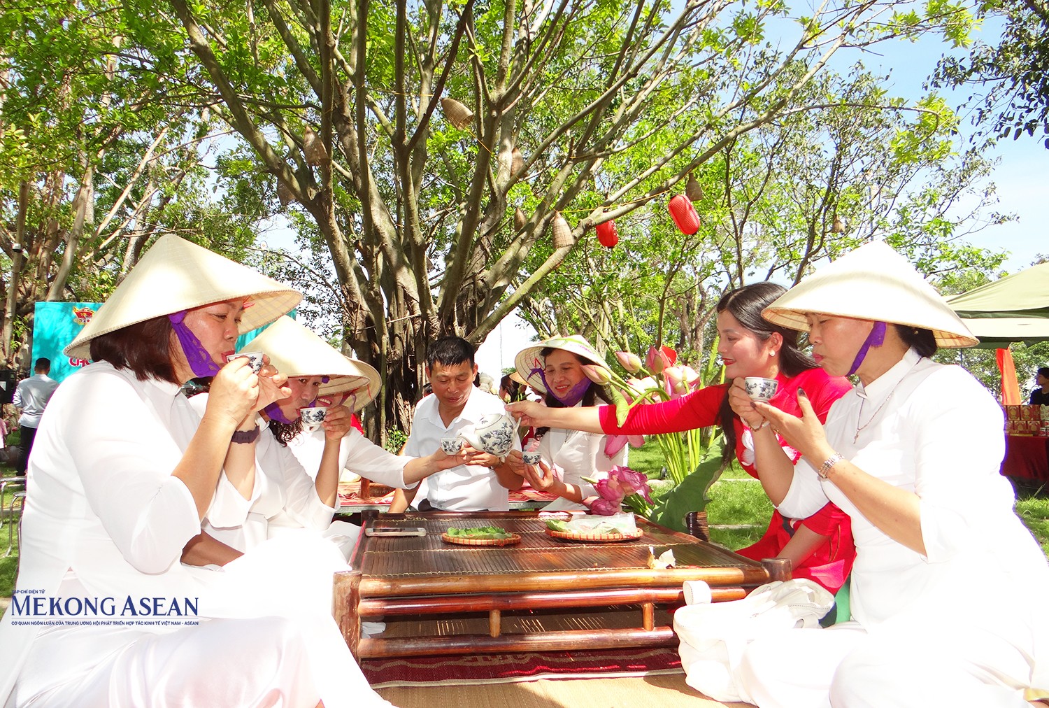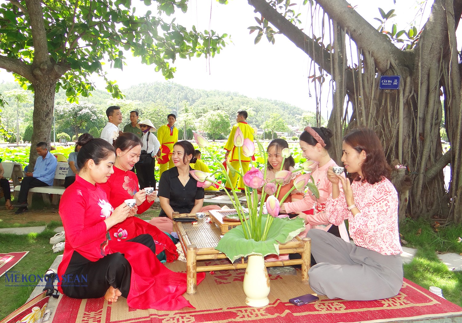 | Các đại biểu trải nghiệm nghệ thuật pha trà và thưởng thức trà sen Kiếp Bạc tại sự kiện. |