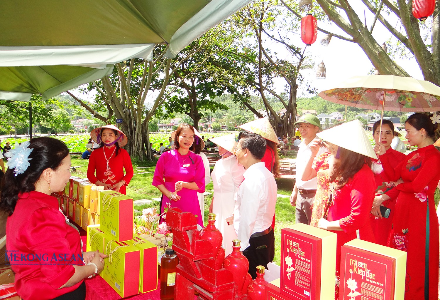 | Lãnh đạo Ban Quản lý di tích Côn Sơn - Kiếp Bạc giới thiệu đến các đại biểu, du khách sản phẩm trà sen đóng hộp, rượu sen Kiếp Bạc trưng bày tại không gian sự kiện. |