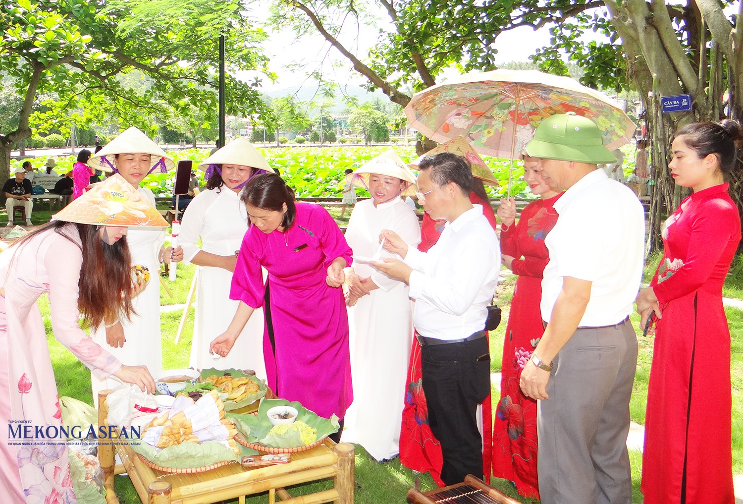 | Đại biểu, du khách thưởng thức các món ẩm thực từ sen Kiếp Bạc. |