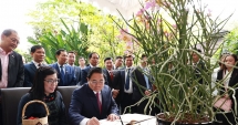 Sau khi ký sổ lưu niệm, Tổng Bí thư Tô Lâm và Phu nhân gắn biển tên cho cây hoa lan và tham quan vườn hoa lan.