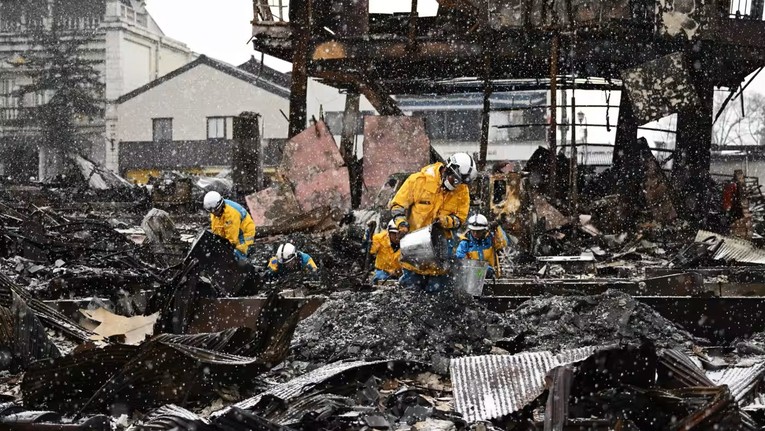 | Cảnh sát tìm kiếm các nạn nhân tại Wajima, tỉnh Ishikawa, Nhật Bản, ngày 7/1. Ảnh: Nikkei Asia |