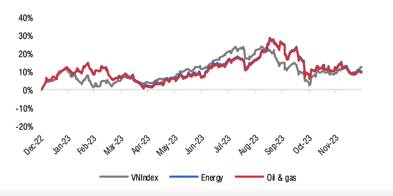 | Năm 2023, giá cổ phiếu ngành dầu khí tăng 9% - thấp hơn so với chỉ số VNIndex nhưng chứng kiến sự phân hóa. Nguồn: SSI |