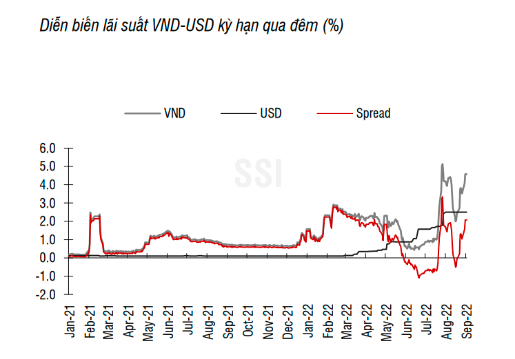 Lãi suất VND liên ngân hàng kỳ hạn qua đêm được đẩy mạnh lên 4,5% (tăng 105 điểm cơ bản so với tuần trước), tạo một khoảng cách khá an toàn với lãi suất USD. Các kỳ hạn khác như 1 tuần đến 1 tháng không có nhiều chênh lệch mạnh, dao động quanh mức 4,6 – 4,9%.