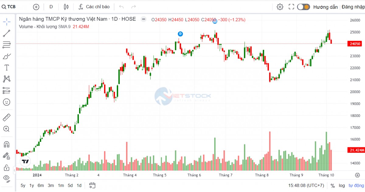 Trên thị trường chứng khoán, chốt phiên giao dịch ngày 4/10, cổ phiếu TCB đóng cửa ở mức 24.050 đồng/cp, tăng khoảng 54% so với hồi đầu năm.