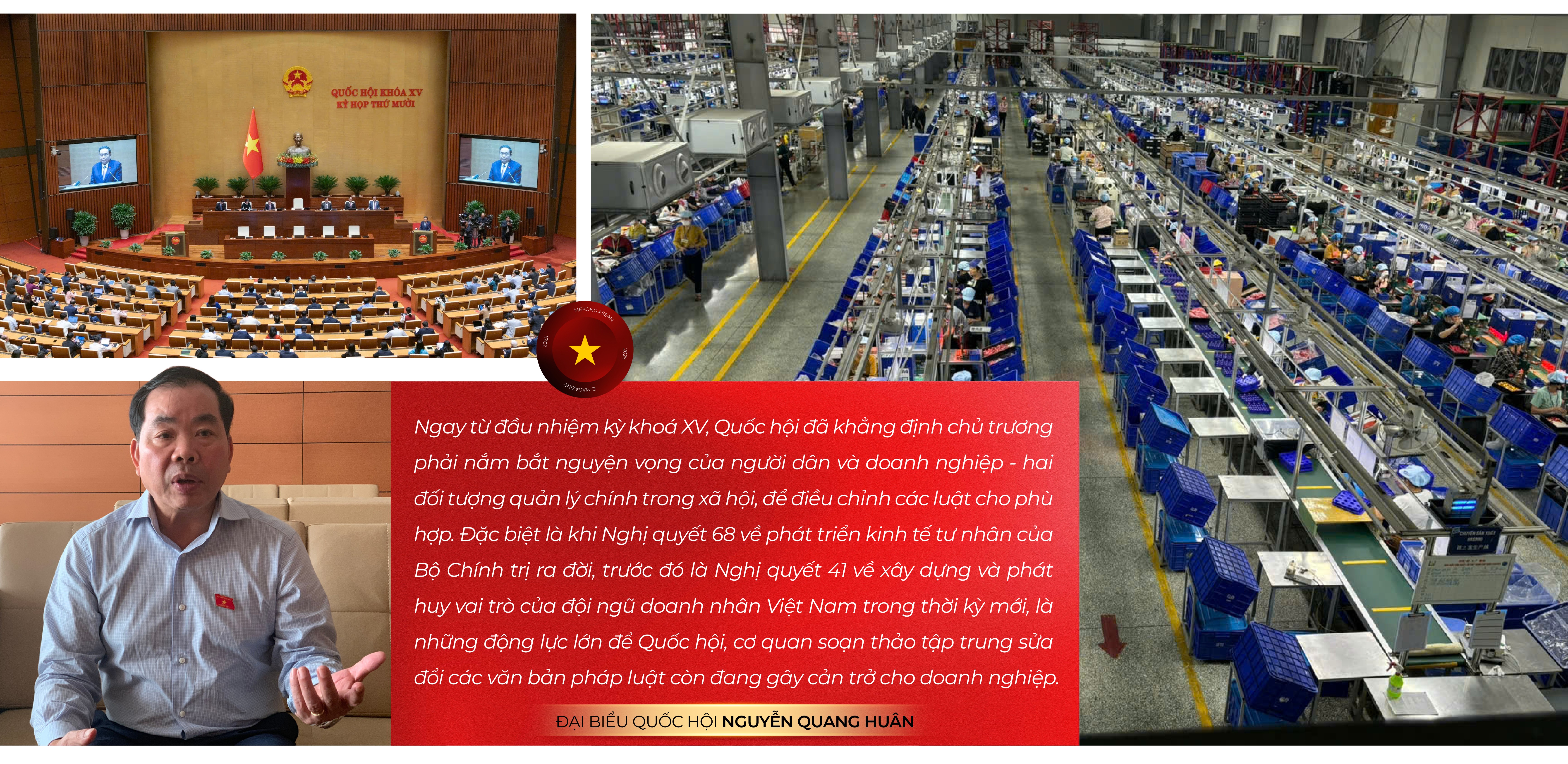 Theo đại biểu Quốc hội Nguyễn Quang Huân (Phó Chủ tịch Hội doanh nhân tư nhân Việt Nam, Chủ tịch HĐQT CTCP Halcom Việt Nam), vẫn còn một số vướng mắc về mặt thể chế cần được giải quyết. Tại kỳ họp thứ 10, Quốc hội dự kiến sẽ xem xét thông qua 49 luật và 4 nghị quyết - số lượng nội dung lập pháp lớn nhất từ đầu nhiệm kỳ khóa XV. Trong đó, có nhiều luật liên quan đến hoạt động doanh nghiệp như Luật Phá sản (sửa đổi); Luật Thương mại điện tử; Luật Đầu tư (sửa đổi); Luật sửa đổi, bổ sung một số điều của Luật Kinh doanh bảo hiểm...