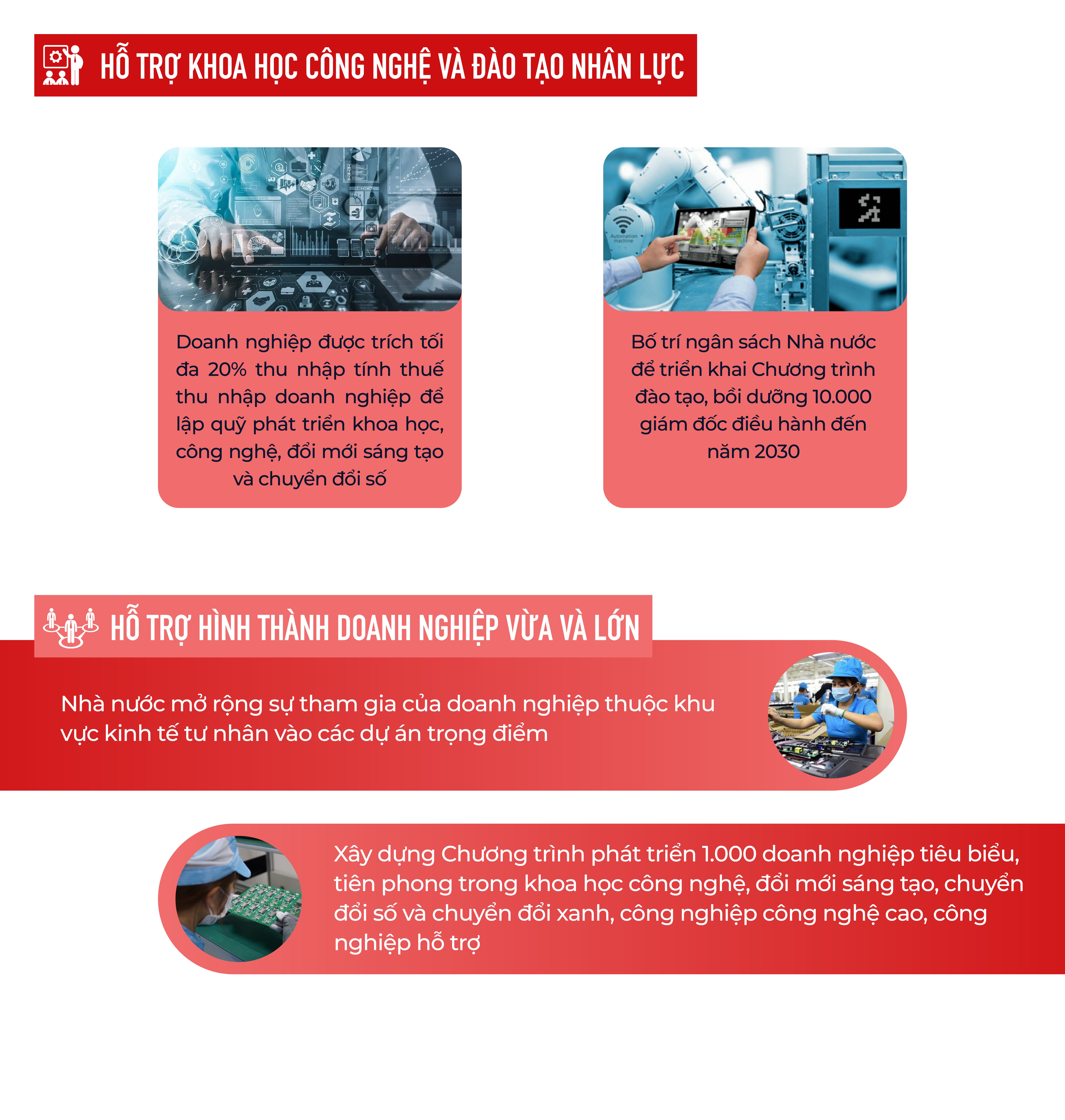 Xác định kinh tế tư nhân là một động lực quan trọng nhất của nền kinh tế, ngày 4/5/2025, Bộ Chính trị đã ban hành Nghị quyết số 68-NQ/TW về phát triển kinh tế tư nhân. Nghị quyết đã nêu hàng loạt giải pháp, tạo dựng những thuận lợi về thể chế, tư duy, chính sách thông thoáng hơn, nhằm khơi dậy niềm tin, khát vọng dân tộc, khát vọng thịnh vượng của những thế hệ doanh nhân Việt Nam, tạo xung lực mới, khí thế mới để đội ngũ doanh nhân, doanh nghiệp hành động. Ngay sau đó, ngày 17/5/2025, tại kỳ họp thứ 9, Quốc hội khoá XV thông qua Nghị quyết số 198/2025/QH15 về một số cơ chế, chính sách đặc biệt phát triển kinh tế tư nhân.