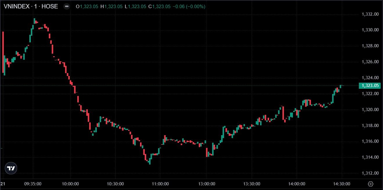 Chốt phiên 21/5, VN-Index tăng 7,9 điểm, tương đương 0,6% lên 1.323,05 điểm. Thanh khoản trên sàn HOSE đạt 1,065 tỷ cổ phiếu khớp lệnh, tương đương giá trị 25.241 tỷ đồng, tăng lần lượt 11,75% và 10,05% so với phiên 20/5.