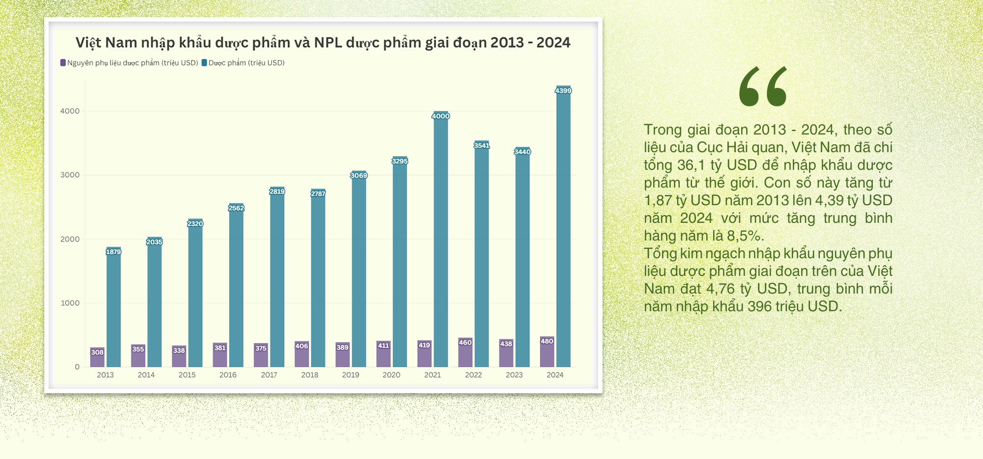 Tuy nhiên, khoảng 50% nhu cầu của Việt Nam vẫn phụ thuộc vào nhập khẩu. Mekong ASEAN tính toán từ số liệu của Cục Hải quan, giai đoạn 2013 - 2024, Việt Nam đã chi tổng 36,1 tỷ USD để nhập khẩu dược phẩm từ thế giới. Kim ngạch nhập khẩu nguyên phụ liệu dược phẩm giai đoạn trên cũng đạt 4,76 tỷ USD.