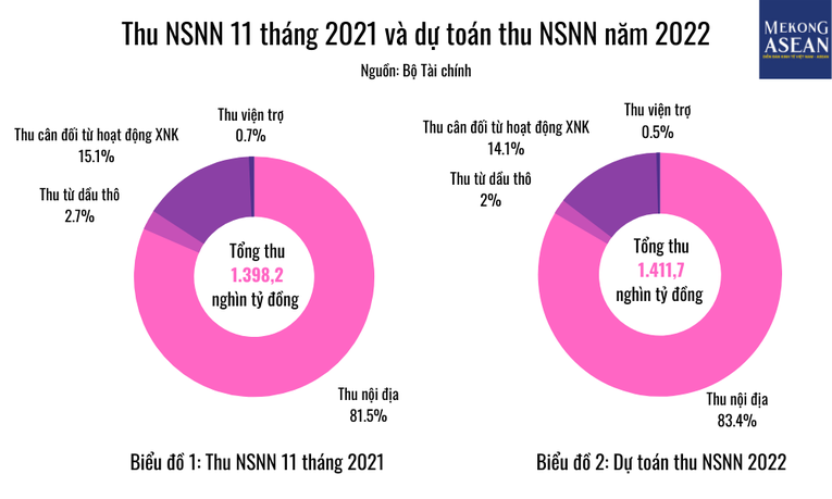 Tuần qua, Bộ Tài chính vừa trình Chính phủ báo cáo Quốc hội thông qua dự toán NSNN 2022 với mức dự toán thu 1.411,7 nghìn tỷ đồng, tức tăng khoảng 5% so với mức dự toán năm 2021. Trong đó, mục tiêu tỷ trọng thu nội địa chiếm 83,4% tổng thu NSNN, thu dầu thô chiếm 2% và thu cân đối từ hoạt động xuất nhập khẩu chiếm 14,1%.