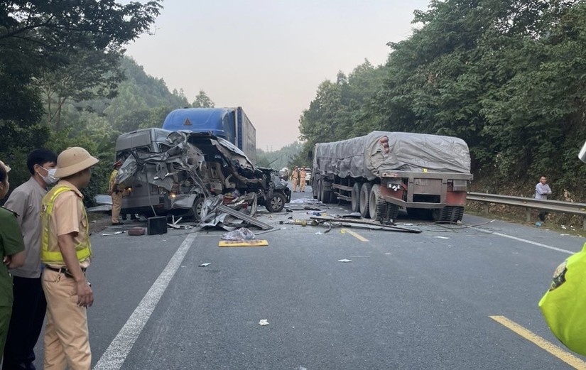 Xe ô tô khách 16 chỗ ngồi mang biển kiểm soát 14B-03657 đã va chạm với xe sơ mi rơ moóc và xe container đi theo chiều ngược lại, khiến 5 người tử vong và nhiều người bị thương, 3 xe ô tô hư hỏng nặng.