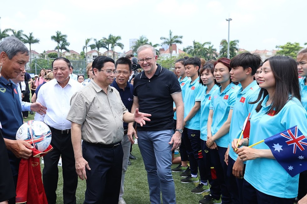 Gặp gỡ, động viên các cầu thủ tham gia tập huấn, Thủ tướng Phạm Minh Chính và Thủ tướng Australia Anthony Albanese nhấn mạnh vai trò quan trọng của thể thao trong việc trao quyền cho phụ nữ, trẻ em gái và phát huy hết tiềm năng của mình.