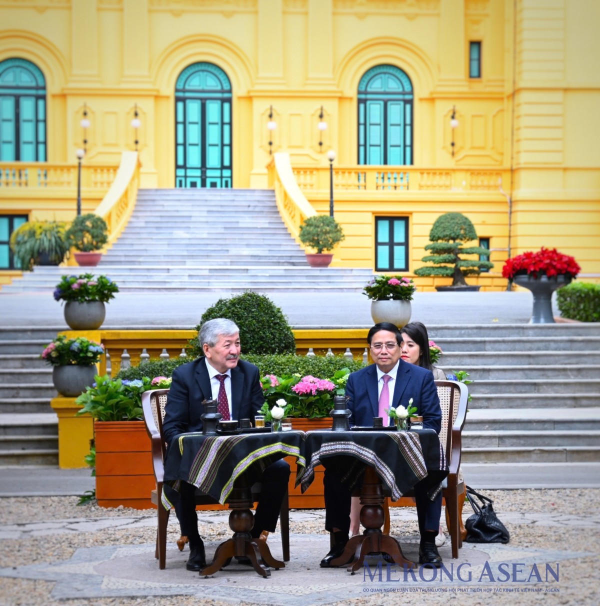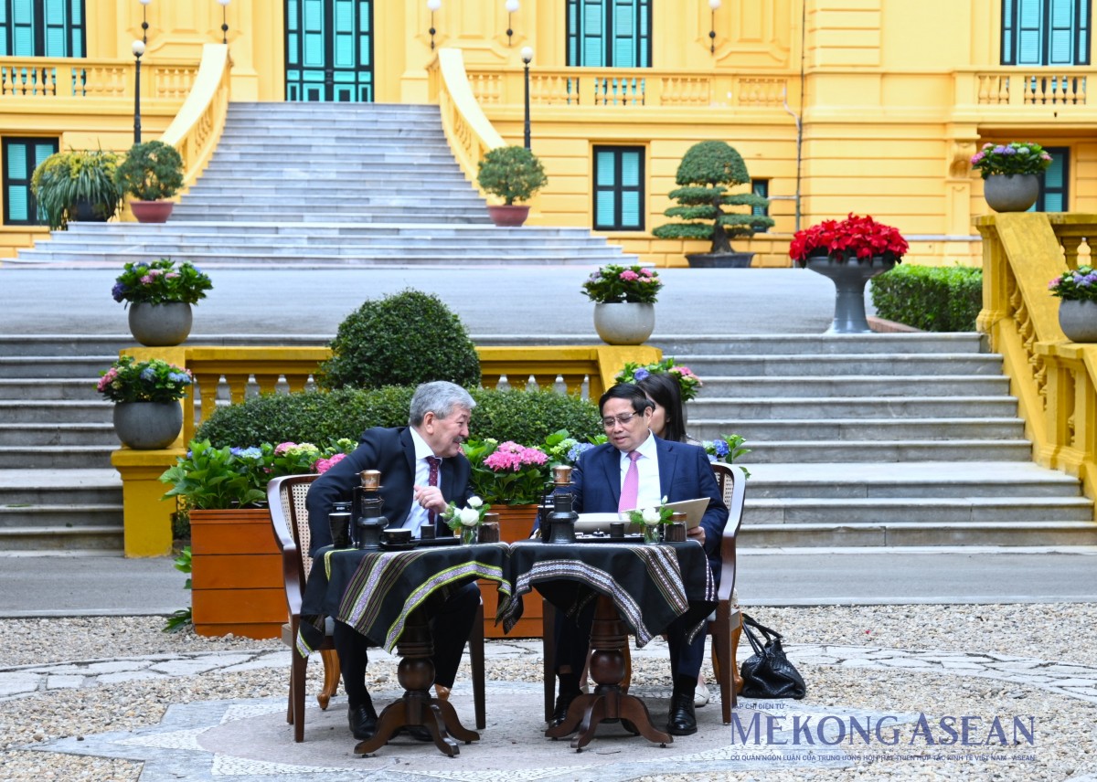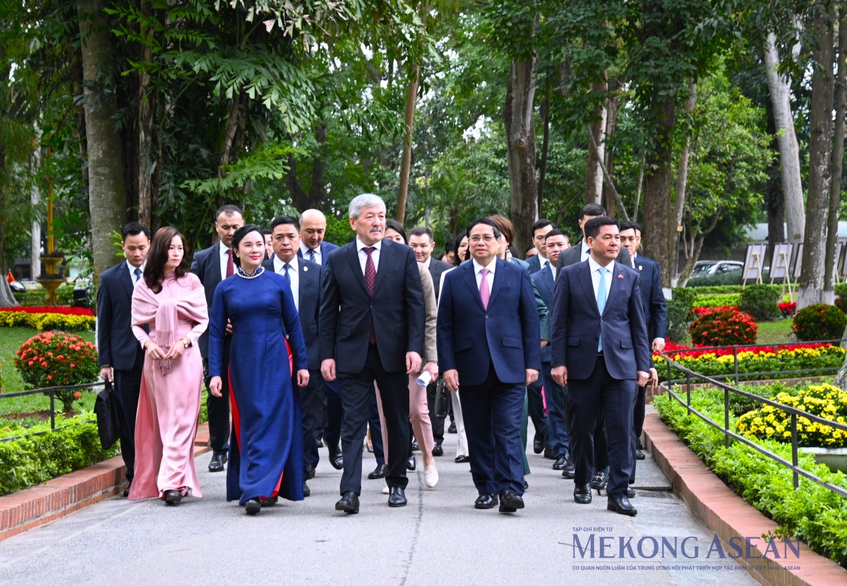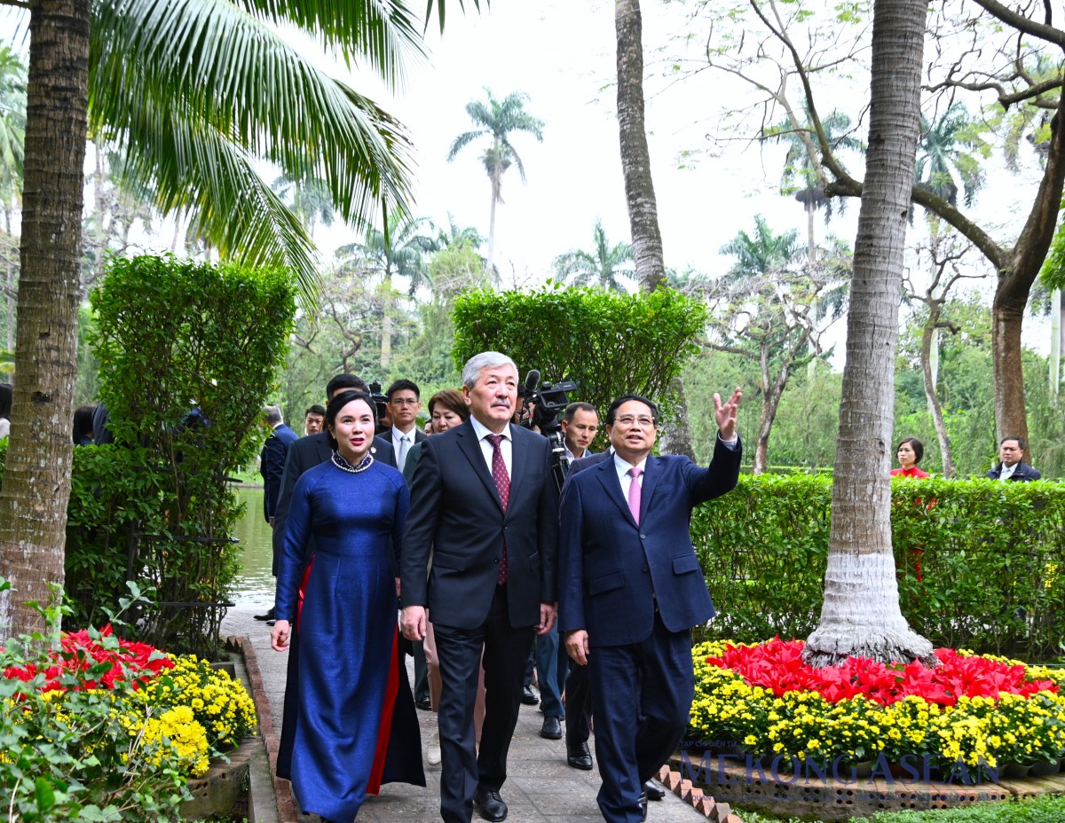 | Thủ tướng Phạm Minh Chính và Thủ tướng Kyrgzystan Adylbek Kasymaliev đi dạo trong Khu Di tích Phủ Chủ tịch. Ảnh: Đỗ Thảo - Mekong ASEAN |
