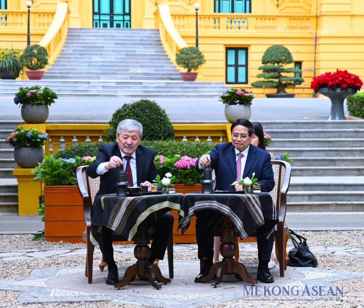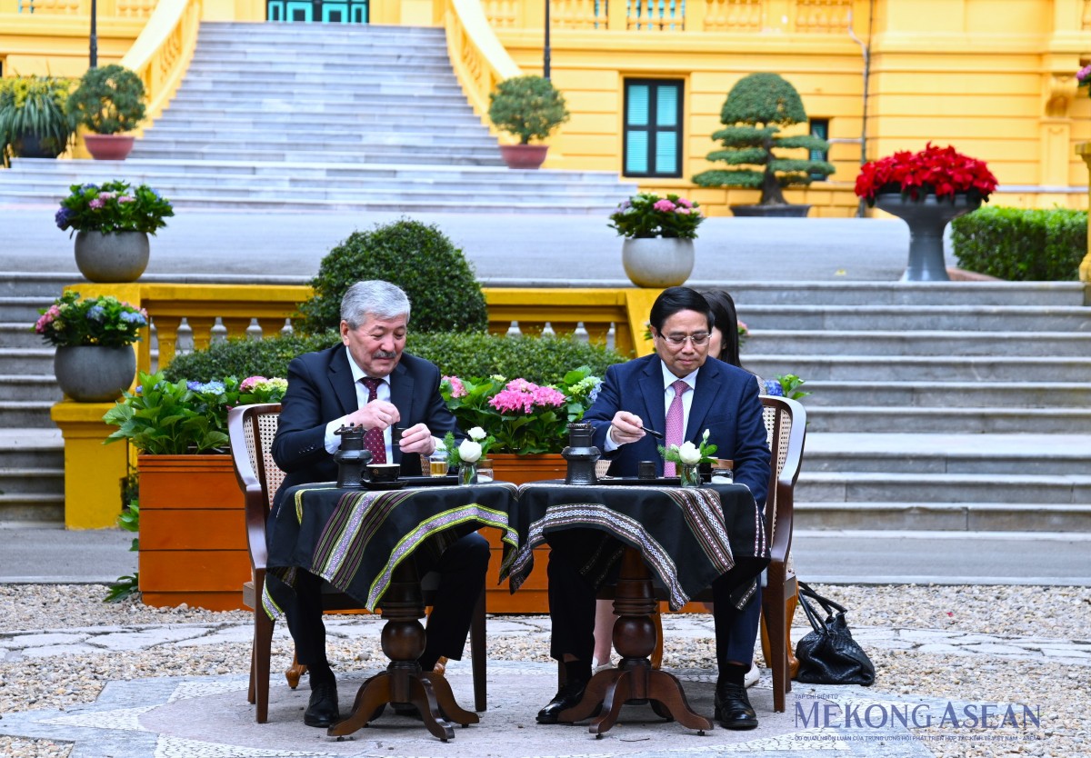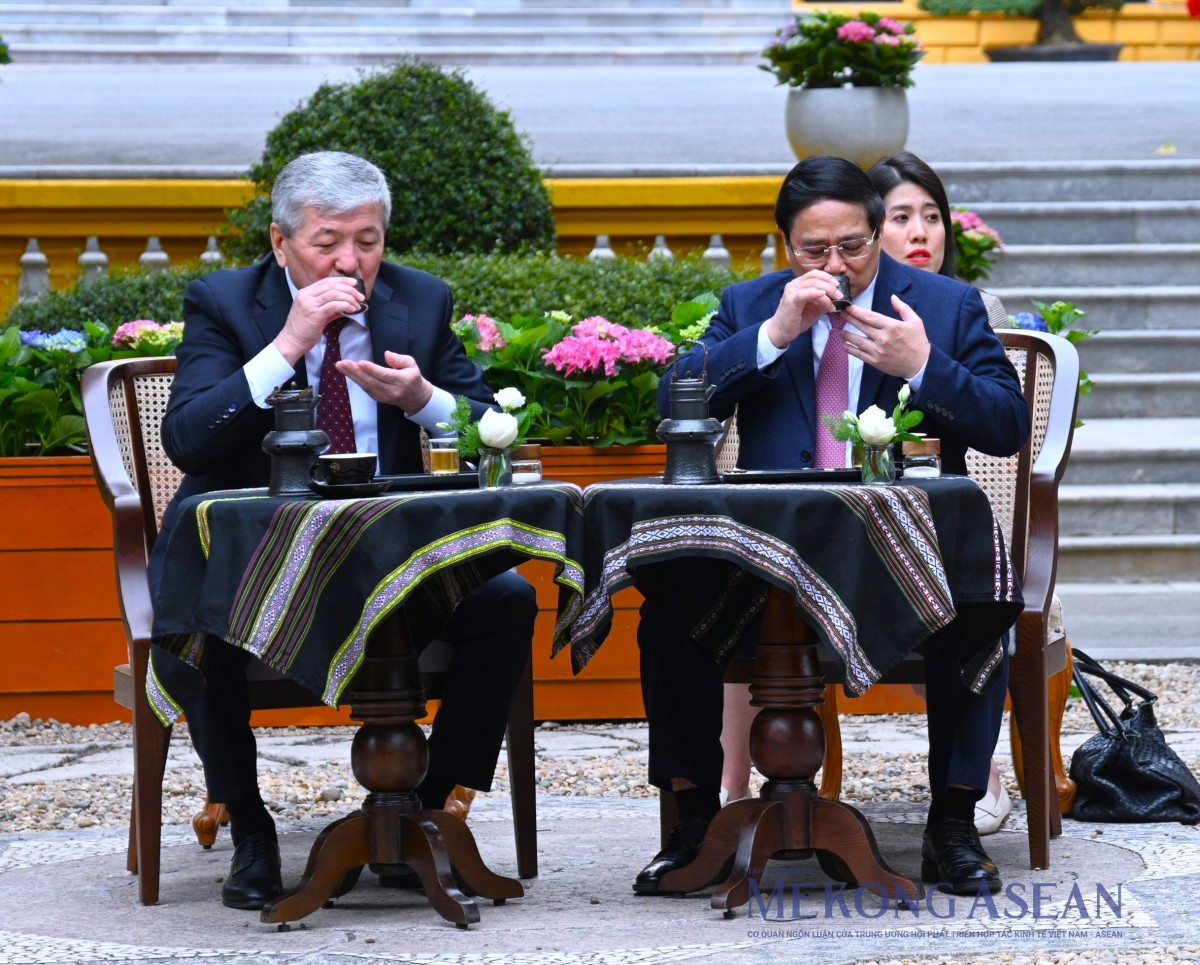 Tiếp đó, trước tượng đồng “Bác Hồ ngồi làm việc trong vườn hoa Phủ Chủ tịch”, Thủ tướng Phạm Minh Chính đã mời Thủ tướng Adylbek Kasymaliev thưởng thức cà phê Việt Nam. Sinh thời, Chủ tịch Hồ Chí Minh chọn nơi đây để tiếp khách và làm việc trong những ngày nắng đẹp. Tại đây đã diễn ra nhiều cuộc đón tiếp nguyên thủ quốc gia và để lại dấu ấn sâu sắc về phong cách ngoại giao lịch thiệp, tinh tế, gần gũi của Chủ tịch Hồ Chí Minh.