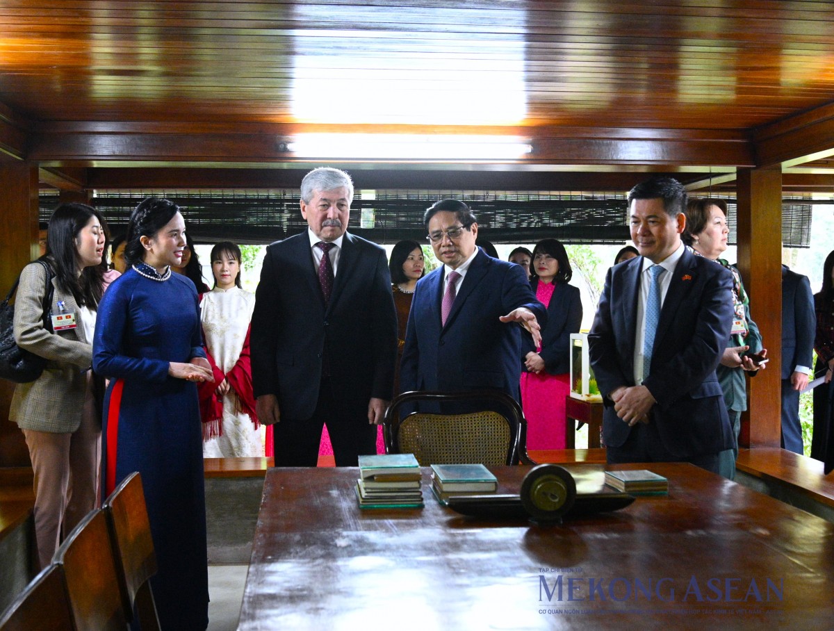 | Thủ tướng Phạm Minh Chính giới thiệu với Thủ tướng Kyrgyzstan Adylbek Kasymaliev về cuộc đời hoạt động cách mạng của Chủ tịch Hồ Chí Minh và các hiện vật tại Nhà sàn Bác Hồ. Ảnh: Đỗ Thảo - Mekong ASEAN |