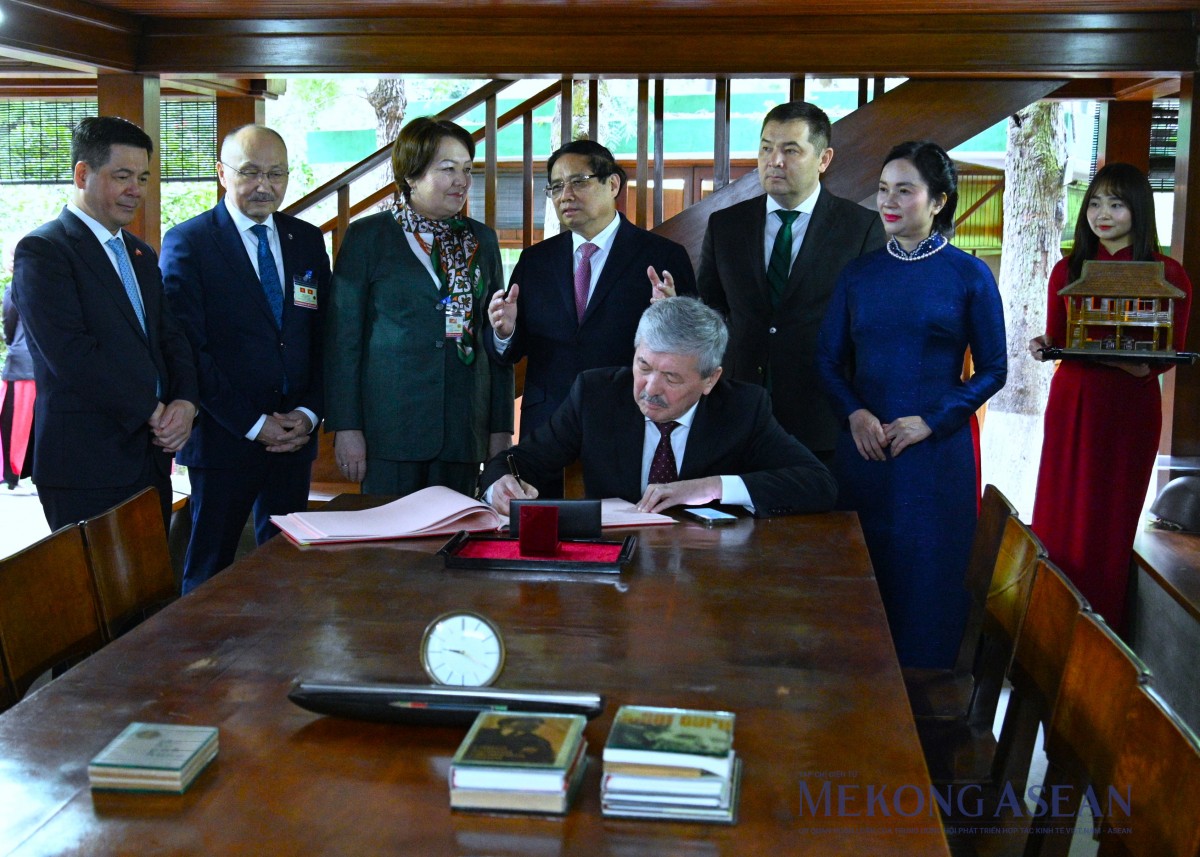 | Thủ tướng Kyrgzystan Adylbek Kasymaliev viết lưu bút tại Nhà sàn Bác Hồ. Ảnh: Đỗ Thảo - Mekong ASEAN |