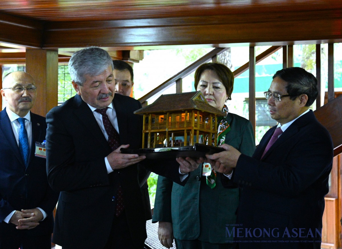 | Thủ tướng Phạm Minh Chính tặng Thủ tướng Adylbek Kasymaliev mô hình Nhà sàn Bác Hồ. Ảnh: Đỗ Thảo - Mekong ASEAN |