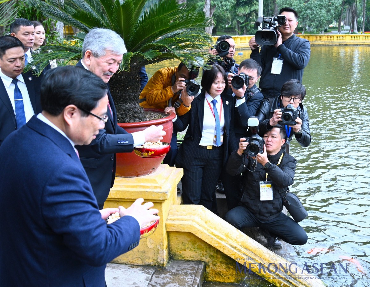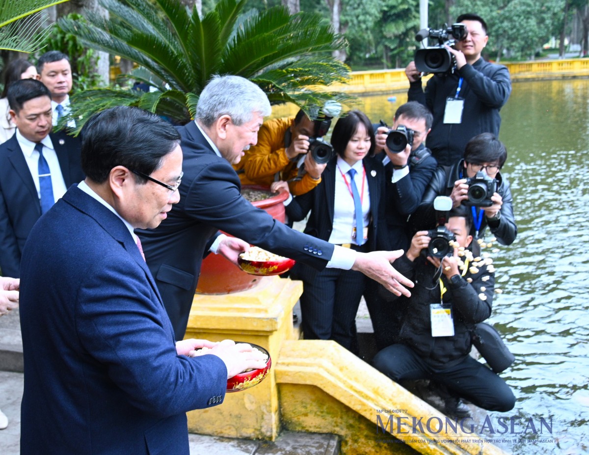 | Hai Thủ tướng thăm ao cá Bác Hồ nằm ngay trước khuôn viên nhà sàn và cho cá ăn. Ảnh: Đỗ Thảo - Mekong ASEAN |