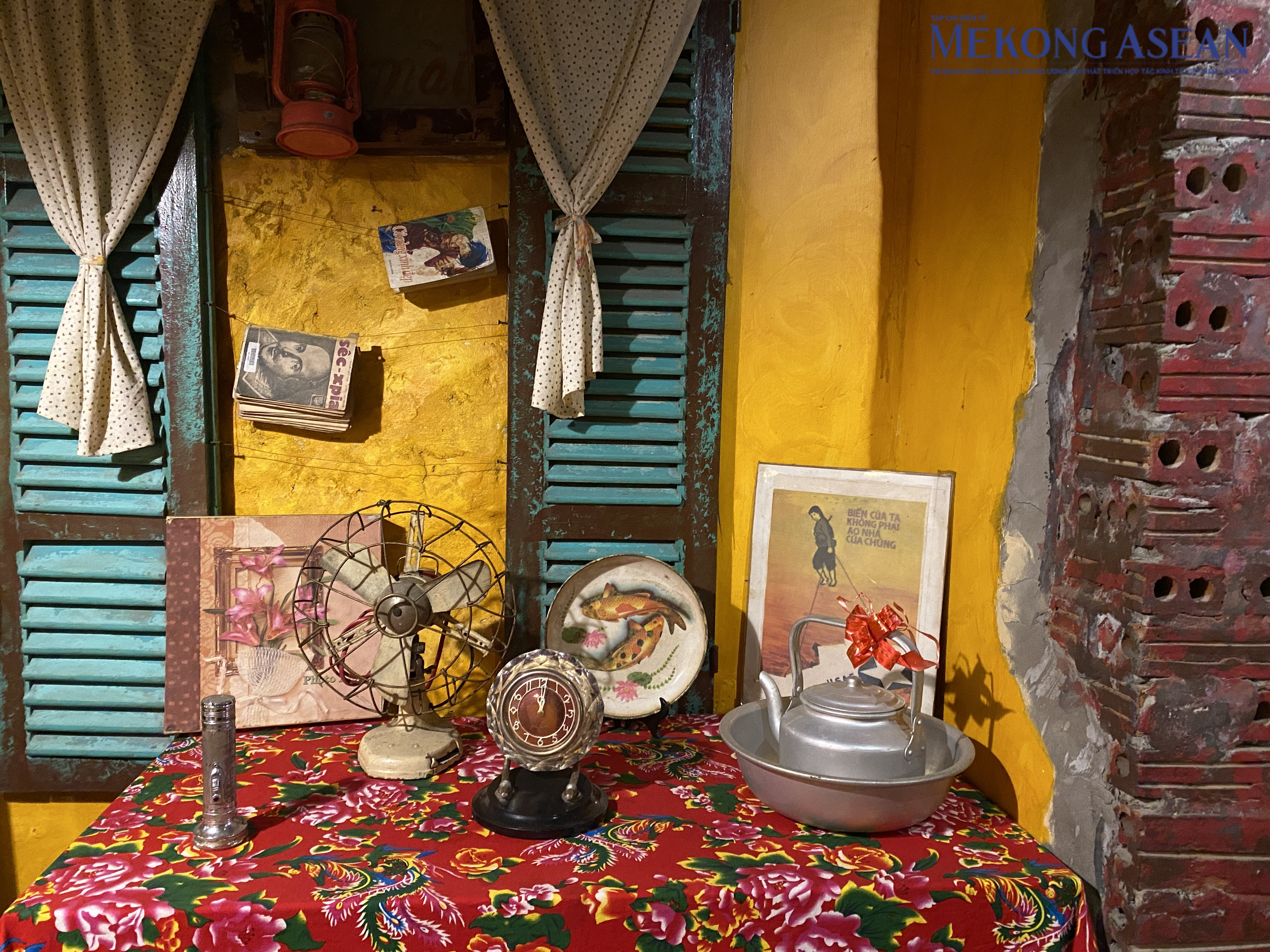 | Gian trong cùng được bài trí như phòng khách của một gia đình thời bao cấp, với chiếc tủ ly, bộ bàn ghế gỗ đã ngả màu. Xung quanh là những vật dụng quen thuộc một thời như vỏ đệm bằng vải chăn con công, chiếc tivi đen trắng, radio, phích nước, quạt bàn… |