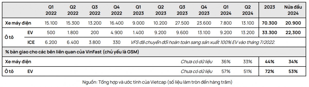 Trong quý 2/2024, chi phí nguyên vật liệu trung bình trên mỗi chiếc xe bàn giao đã giảm 16% so với quý trước và chi phí sản xuất trung bình trên mỗi chiếc xe bàn giao giảm 43%, do sản lượng xe bàn giao tăng và chi phí pin giảm, tối ưu hóa thiết kế... Mặc dù chi tiết về doanh số bàn giao và chi phí trên mỗi đơn vị cho từng mẫu xe không được công bố nhưng Vietcap cho rằng tỷ trọng bàn giao mẫu xe giá cả phải chăng nhiều hơn trong quý 2/2024 có thể cũng đóng góp vào việc giảm chi phí trên mỗi xe trong quý này.