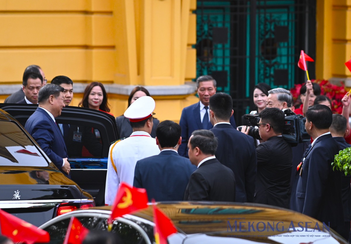 Trong tiếng nhạc chào mừng, Tổng Bí thư Tô Lâm mời Tổng Bí thư, Chủ tịch nước Trung Quốc Tập Cận Bình bước lên bục danh dự. Quân nhạc cử Quốc thiều Trung Quốc và Việt Nam đồng thời 21 phát đại bác chào mừng được bắn từ Hoàng thành Thăng Long trong Lễ đón.