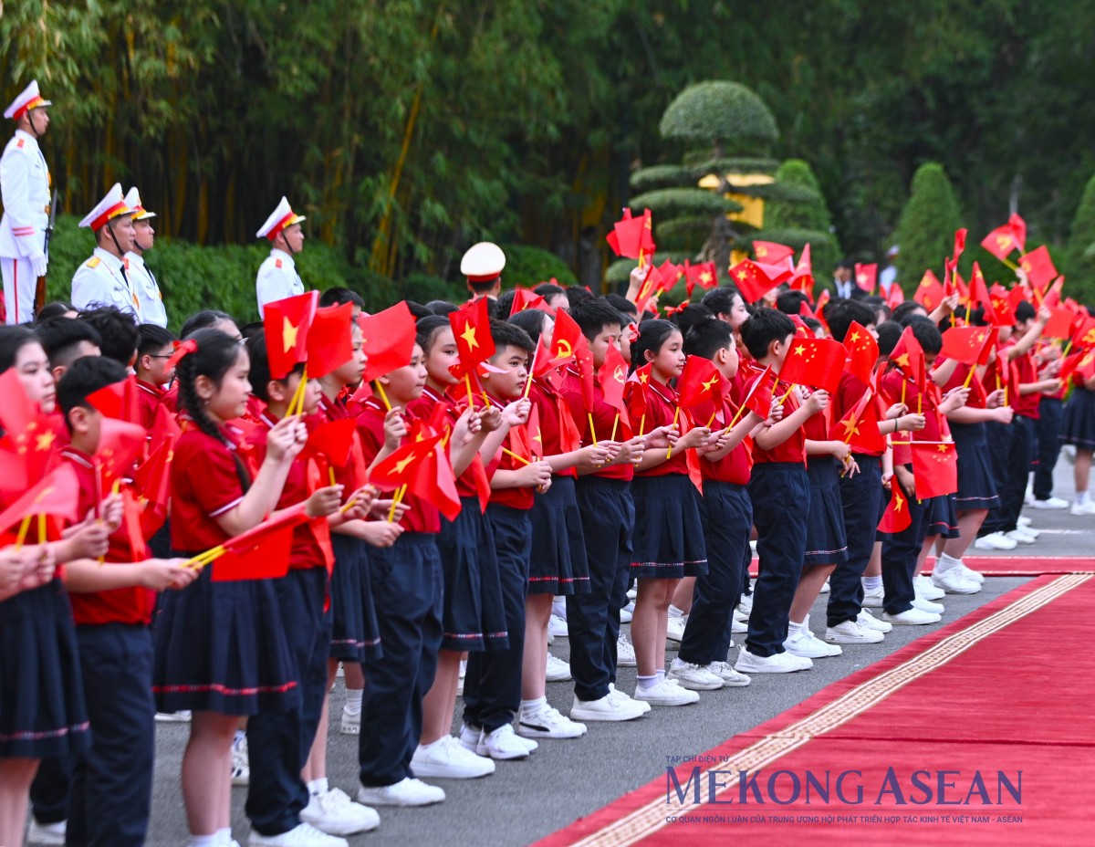 Các em thiếu nhi vẫy cờ Việt Nam và Trung Quốc chào đón hai nhà lãnh đạo. Ảnh: Đỗ Thảo - Mekong ASEAN