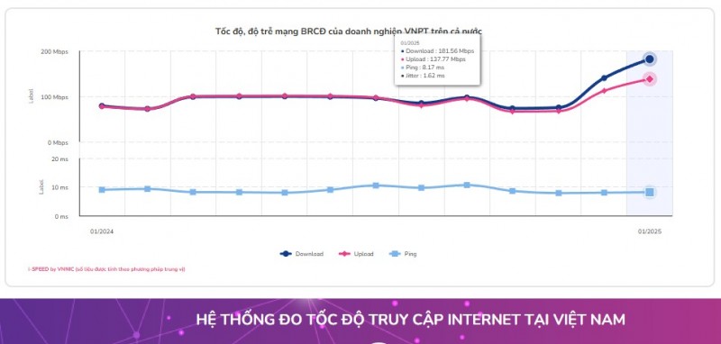 Dữ liệu từ i-Speed cho thấy, trong tháng 12/2024, tốc độ tải xuống (download) Internet của VNPT là 140 Mbps, tốc độ upload (tải lên) là 111.88 Mbps thì sang tháng 1/2025, tốc độ tải xuống Internet của nhà mạng này đạt 181.56 Mbps và tốc độ tải lên đạt 137.77 Mbps. Tốc độ Internet WiFi trung bình của VNPT cao hơn các nhà mạng khác gần 1,5 lần.