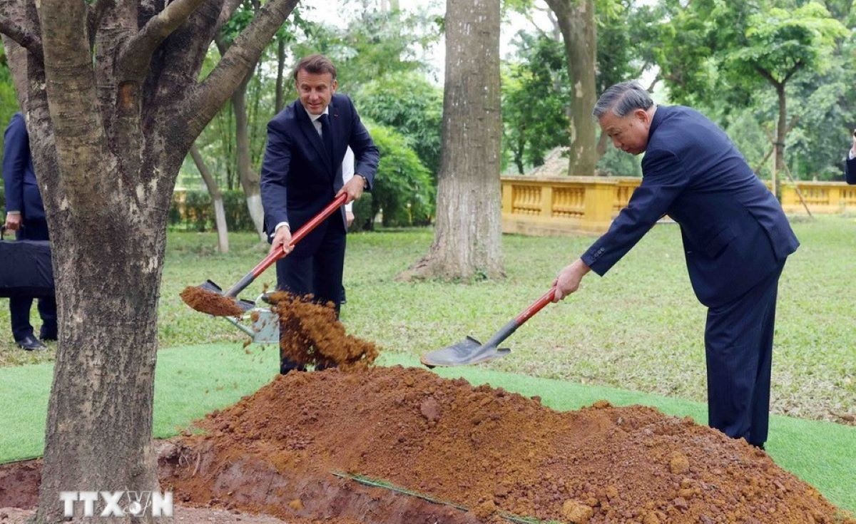 Chiều cùng ngày, Tổng Bí thư Tô Lâm và Tổng thống Pháp Emmanuel Macron thăm Khu di tích Chủ tịch Hồ Chí Minh tại Phủ Chủ tịch và cùng trồng cây hữu nghị.