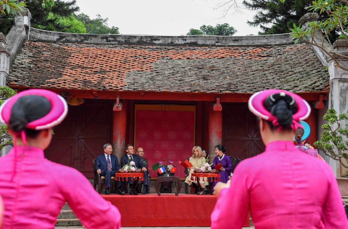 Tổng thống Pháp Emmanuel Macron bày tỏ ngưỡng mộ nền văn hiến, văn hóa, nền giáo dục, truyền thống hiếu học của con người Việt Nam, trong đó Văn Miếu - Quốc Tử Giám - nơi gìn giữ và tôn vinh đạo học, lưu giữ và thể hiện đặc sắc những giá trị nổi bật của văn hiến Việt Nam.