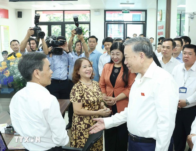 Trước đó, chiều cùng ngày, Tổng Bí thư Tô Lâm và các lãnh đạo TP Hà Nội đã đến thăm, kiểm tra hoạt động và động viên cán bộ, công chức, viên chức tại bộ phận tiếp nhận và xử lý thủ tục hành chính phường Đống Đa.
