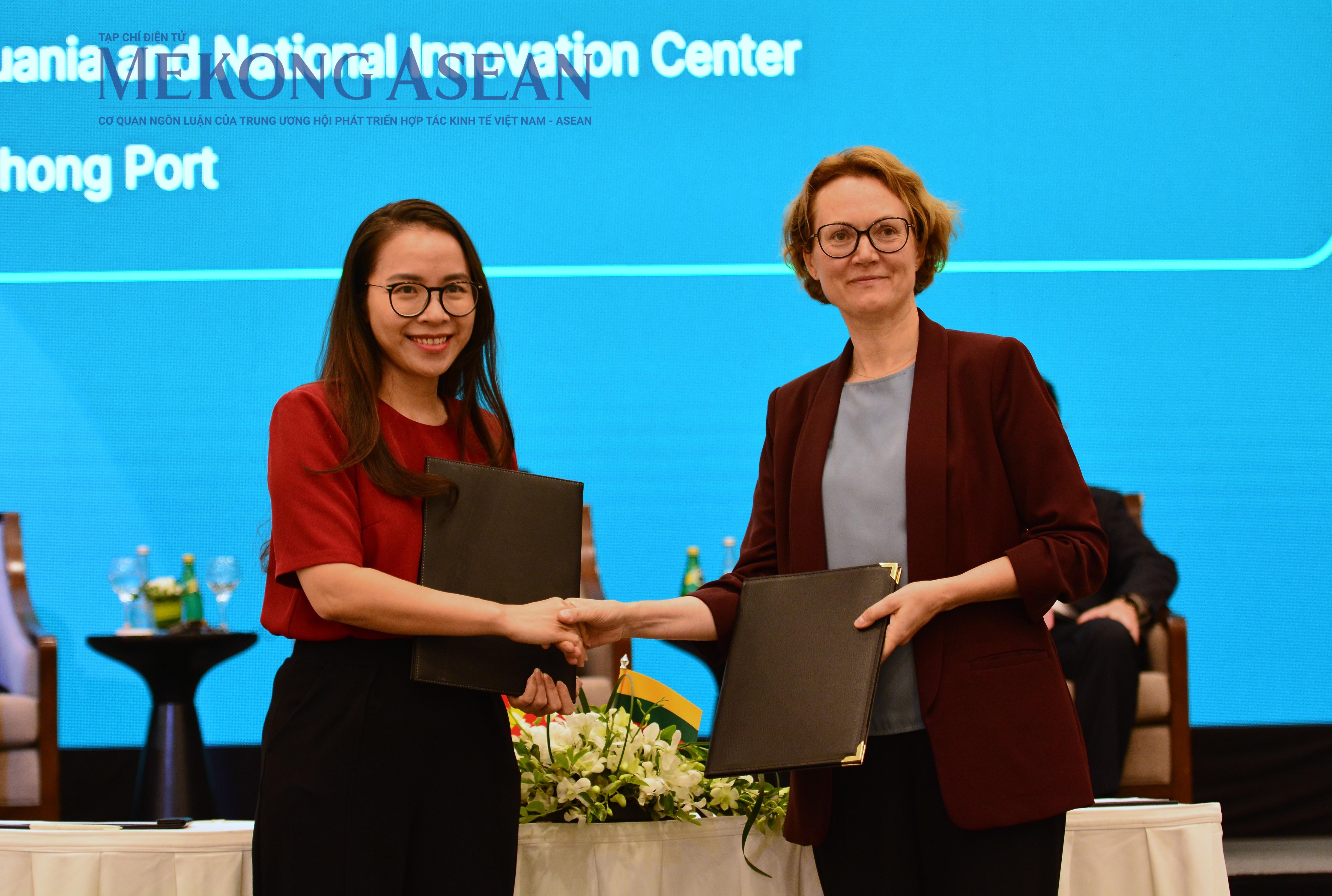 | Đại diện Trung tâm Đổi mới Sáng tạo Quốc gia Việt Nam (NIC) (trái) và Cơ quan đổi mới Lithuania (phải) ký kết biên bản ghi nhớ tại diễn đàn. Ảnh: Lê Hồng Nhung - Mekong ASEAN |