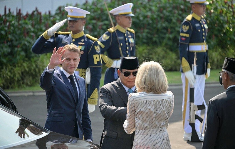 | Tổng thống Indonesia Prabowo Subianto đón Tổng thống Pháp Emmanuel Macron và Phu nhân. Ảnh: AFP |
