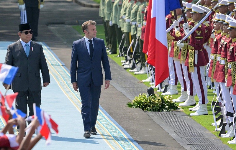 | Tổng thống Prabowo Subianto và Tổng thống Pháp Emmanuel Macron duyệt Đội danh dự Quân đội Indonesia. Ảnh: Getty |