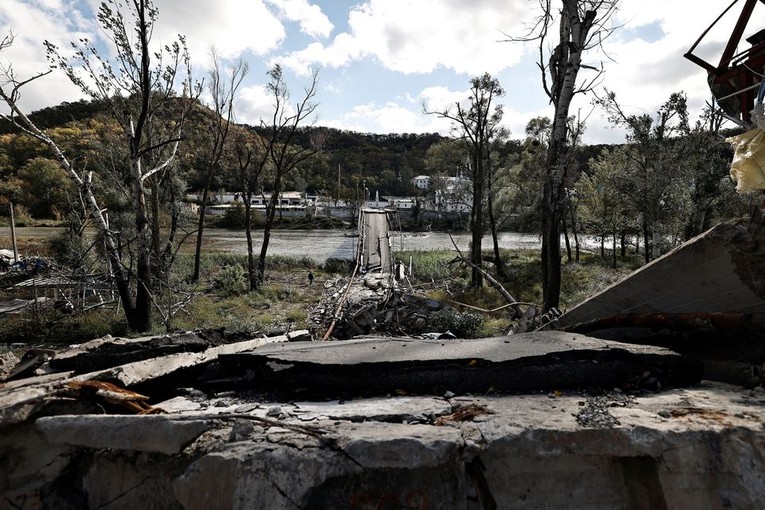 | Một cây cầu bị đánh sập ở Svyatohirsk, tỉnh Donetsk, Ukraine, ngày 3/10. Ảnh: Reuters |